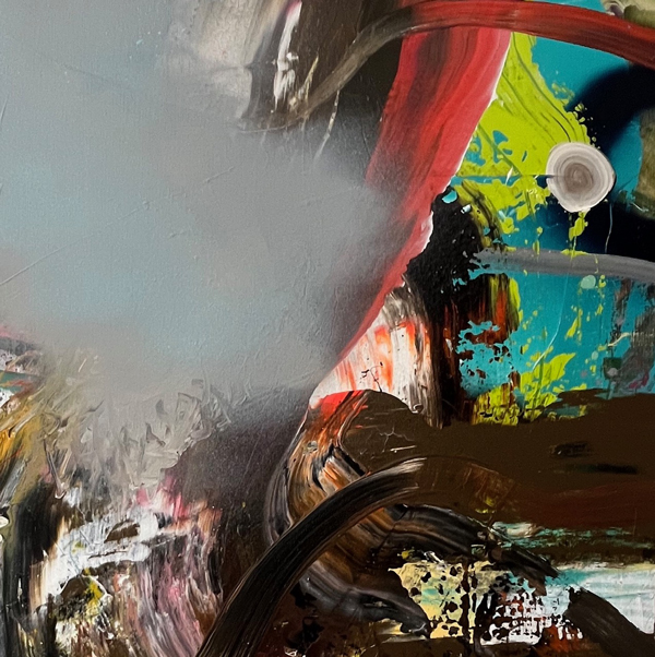 Dem gegenüber stehen die dionysischen Arbeiten, die aus einem Zustand der Ekstase und des Rausches entstehen. Hier nutzt Tobias die abstrakte Malerei als Werkzeug der Selbstbefreiung. Es ist ein bewusster Bruch mit der Kontrolle des Ichs, um den Impulsen des Unterbewusstseins freien Lauf zu lassen. Für Tobias Kielinger wird die Abstraktion erst in diesem Moment der Entgrenzung vollkommen verständlich: Sie ist der Weg, die Last der eigenen Individualität abzulegen und in einen Zustand reiner, unmittelbarer Existenz einzutauchen.
