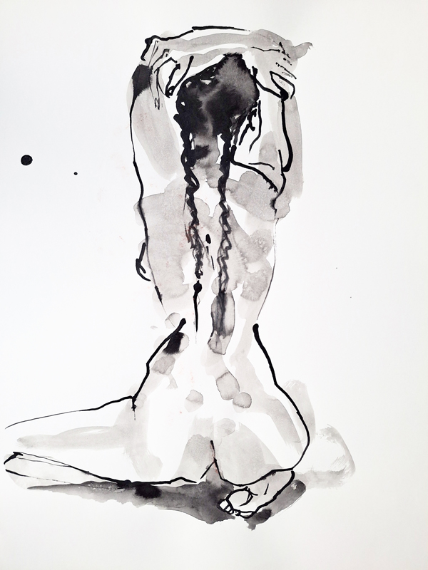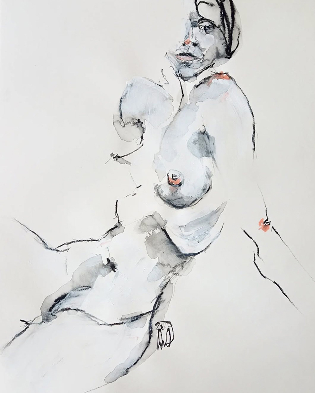 Im Dialog mit dem Modell. In kurzen, zeitlich begrenzten Sequenzen entstehen Zeichnungen und Mischformen von Zeichnung und Malerei, die den flüchtigen Charakter der Pose bewahren. Das intuitive Festhalten des Moments bildet den zentralen Gedanken in Susanne Winklers künstlerischem Schaffen und wird besonders in ihren Aktzeichnungen sichtbar.